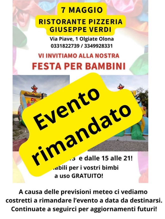 Domenica 7 maggio vieni al Ristorante Pizzeria Verdi a Olgiate Olona per la festa per i più piccoli che stiamo organizzando per te e i tuoi bambini.