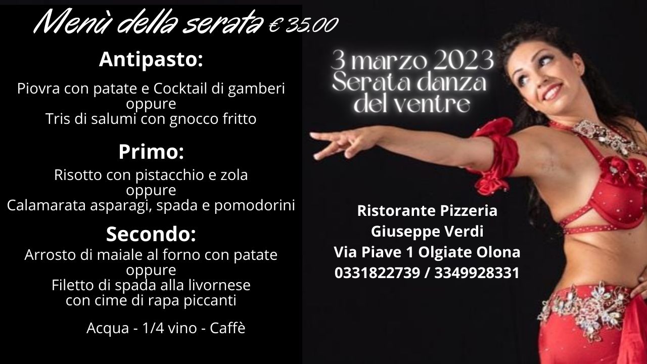 Venerdì 3 Marzo vieni al Ristorante Pizzeria Verdi a Olgiate Olona per una favolosa cena con spettacolo di danza del ventre!